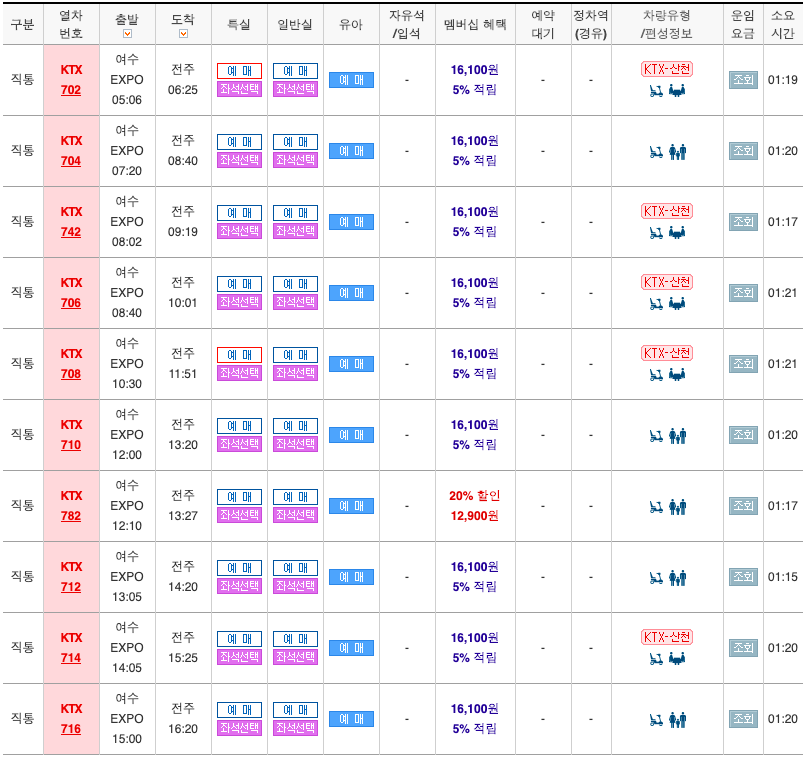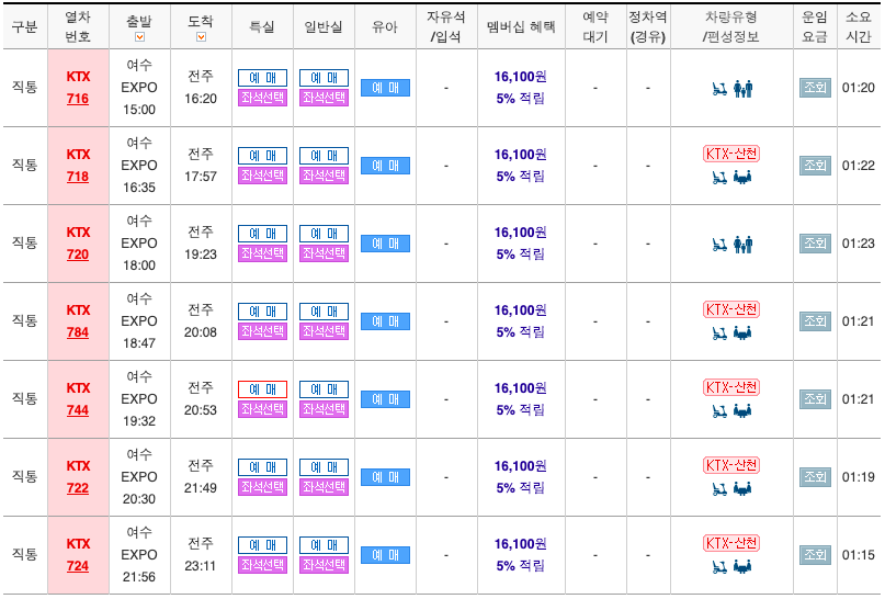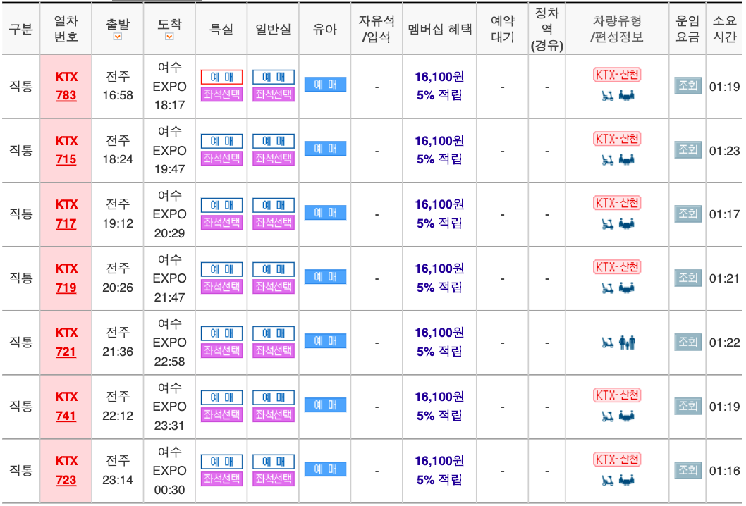 전주에서 여수 가는 열차는 시간표가 다양한 편인데요. 그렇기 때문에 여행하는 데 있어 크게 제약을 받는 부분도 없고 시간을 정하기에도 수월할 것 같습니다. 소요 시간은 1시간 20분 정도이며 가격은 16,100원입니다. 소요 시간이 얼마 걸리지 않기 때문에 요금 역시도 저렴한데요. 여수 여행을 준비하시는 분들은 시간표를 참고해주시면 좋을 것 같습니다.